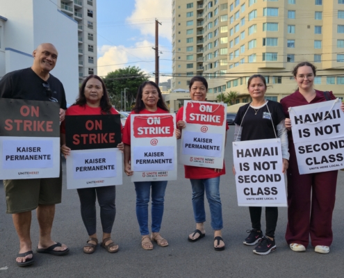 HONOLULU, HI – As of 6:30 a.m., over 1,900 Kaiser Permanente workers represented by UNITE HERE Local 5 (Local 5) are on a limited-duration 5-day strike until Sunday, October 19 at 7 a.m. More than 45,000 Kaiser workers in California, Oregon, and Washington state are also on strike as part of the Alliance of Healthcare Unions. The strike impacts 20 Kaiser locations on O‘ahu, Maui, Kaua‘i, and Hawai‘i Island, and includes medical assistants, hospital aides, lab assistants, dietary specialists, housekeepers, and more.